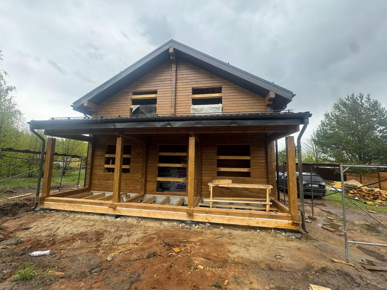Строительство началось с качественного фундамента, затем — точная сборка стен из профилированного бруса камерной сушки. На фото ниже видно, как идёт процесс отделки и герметизации: